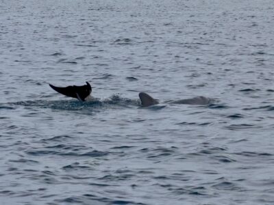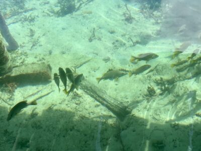 Day 9 We knew Cayo Zapatilla is a popular destination, but it was also a holiday and very good, sunny weather (after few days with some rain) – extra crowded. Current along the beach was very strong, so rather than swimming we were snorkeling while floating fast as in a river. Had to land, go upstream and float downstream again. Decent swimming, but not much to watch underwater. Rangers kept swimmers from venturing further out on the reef as there were many boats coming to the beach (without fins the strong current felt too much for us anyway). Joanna squeezed a fast hike to calmer part of the island. Then we stopped for snorkeling from boats near Cayo Coral – new forms of soft coral for us but not very colorful, very few fish. Stopped for lunch at restaurant on the water (lightly grilled fish and seafood stew with rice) with good view of sea cucumbers and fish hiding under decks. On the way back we were rewarder with sloths sightings (both three-toed and two-toed) and watching bottlenose dolphins playing around. Because of the crowds a private boat would work better – beaches and trail away from the dock were almost empty. Our tour with ☞ Kawi Voyage was well organized, the guide Sophie was very good, and overall we were happy with the tour (recommended).
