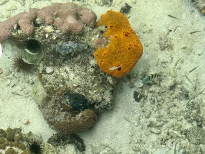 Day 8 Light rain again in the morning – Piotr was very happy with slow start and coffee on the balcony. Tourists we met at the farm recommended snorkeling at Polo Beach. We were anyway planning to go there via Red Frog Beach, but now had additional motivation. Packed snorkeling gear, jumped on small boat to Palmar Dock, paid entrance fee for Red Frog Trail and crossed over small hills to the other side of Bastimentos Island. Red Frog Beach was nice, some resorts and private residences, nice surf. Trail along the coast and through residential area took us to Polo Beach. Some sand flies (?), not too bad. We were on the Caribbean Sea side of the island. Big waves were crushing quite far on the outer side of the reef leaving calm lagoon for snorkeling. Very relaxed feeling. A good spot. Some corals, many types of colorful small fish, a few bigger ones. There was some current parallel to shore, we just lazily floated with it. When getting out, current pushed Joanna’s leg to fire coral – quite painful for one day (maybe vinegar we bought helped), very itchy several days later. We returned home the same way and whom did we meet on the way?